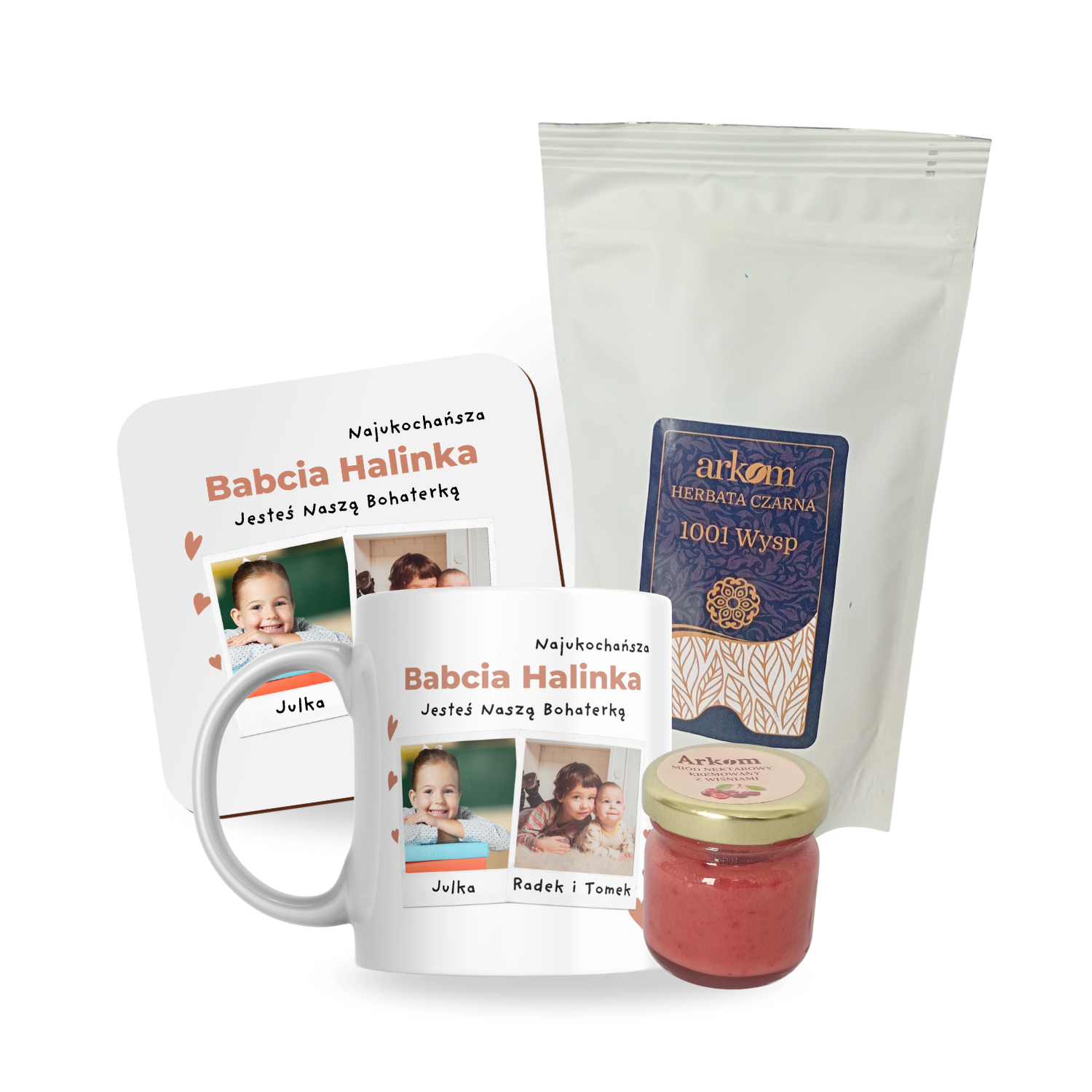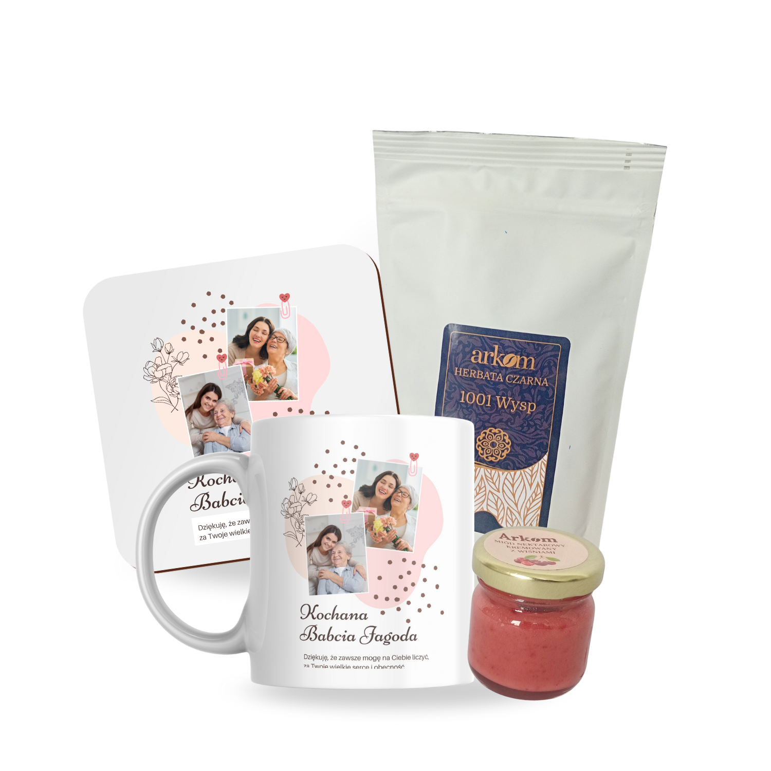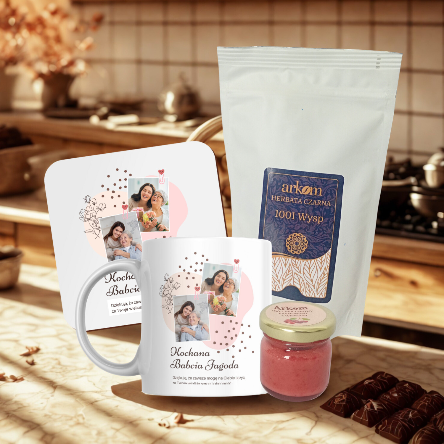 Ten zestaw to idealny sposób, by umilić Babci każdy poranek. Personalizowany kubek i dopasowana podkładka tworzą duet, który rozgrzewa nie tylko dłonie, ale i serce. Aromatyczna herbata i naturalny miód dodają smaku chwilom spokoju i czułości.