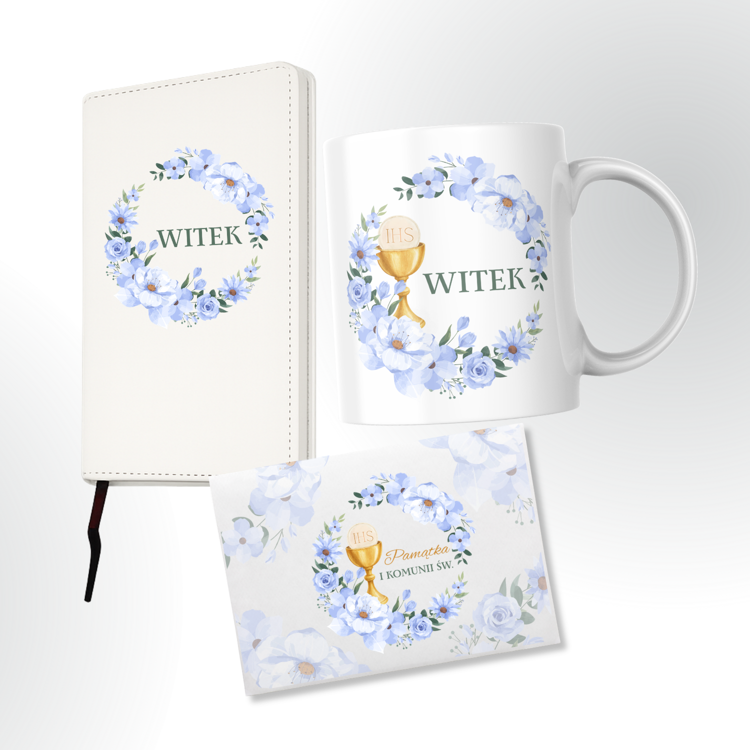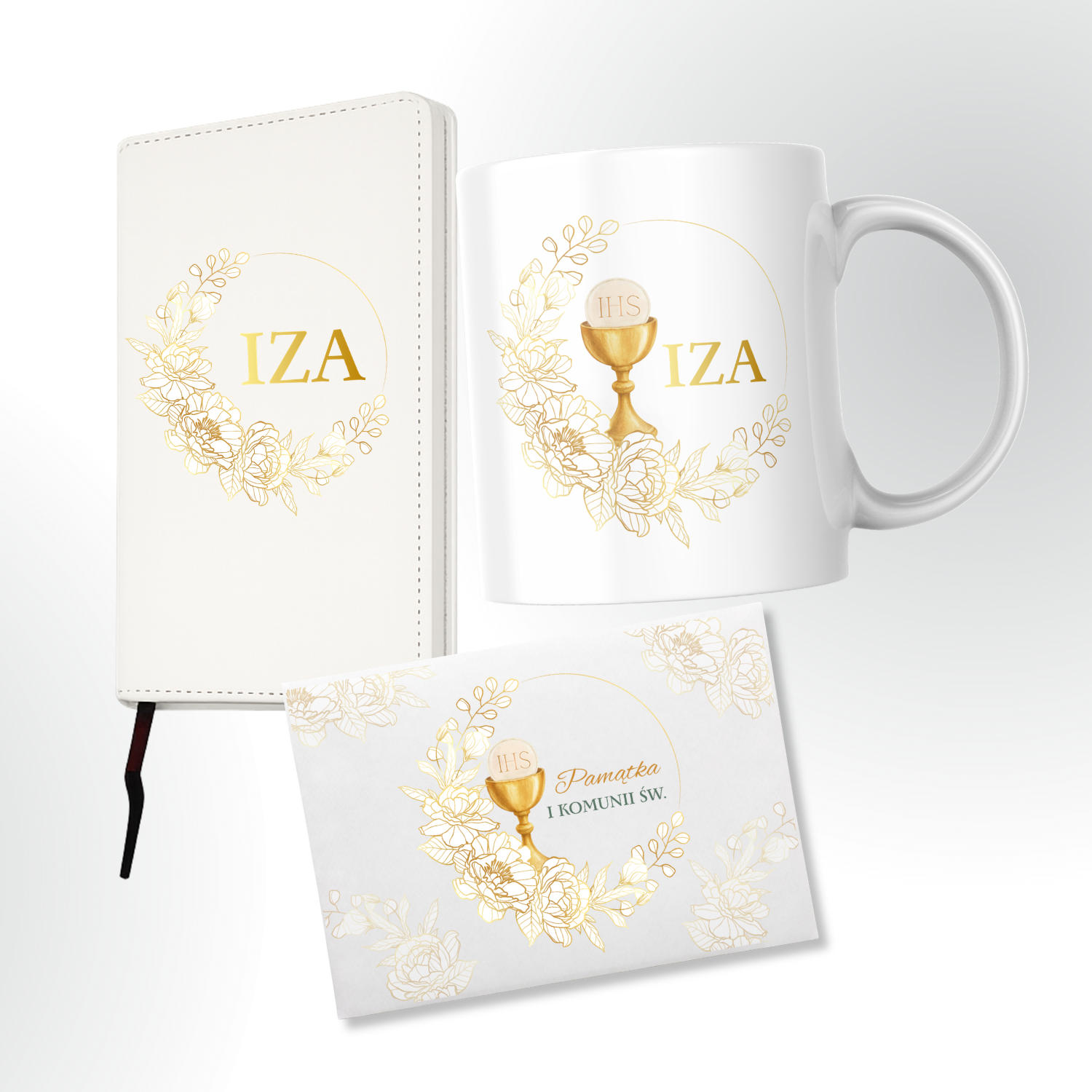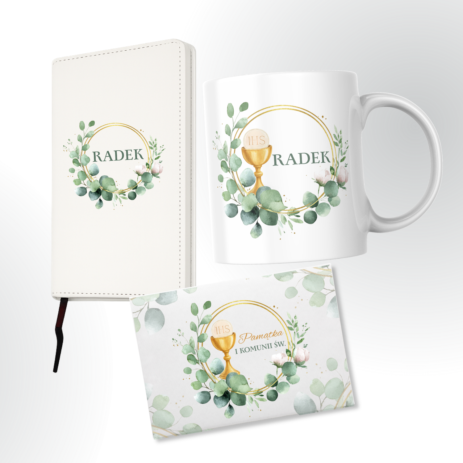 - Uroczy notes z imieniem dziecka i motywem komunijnym.