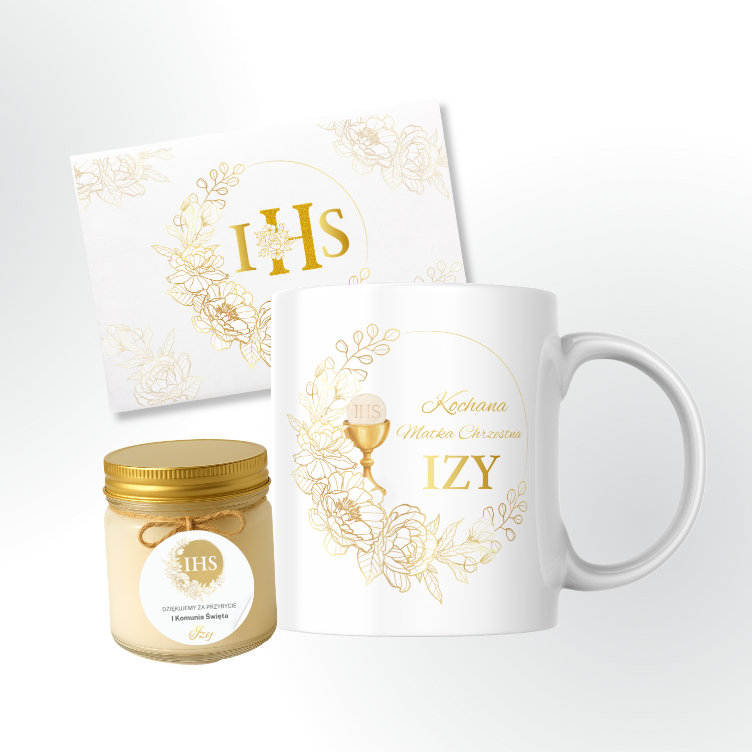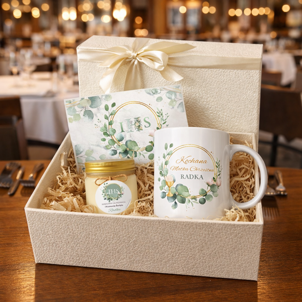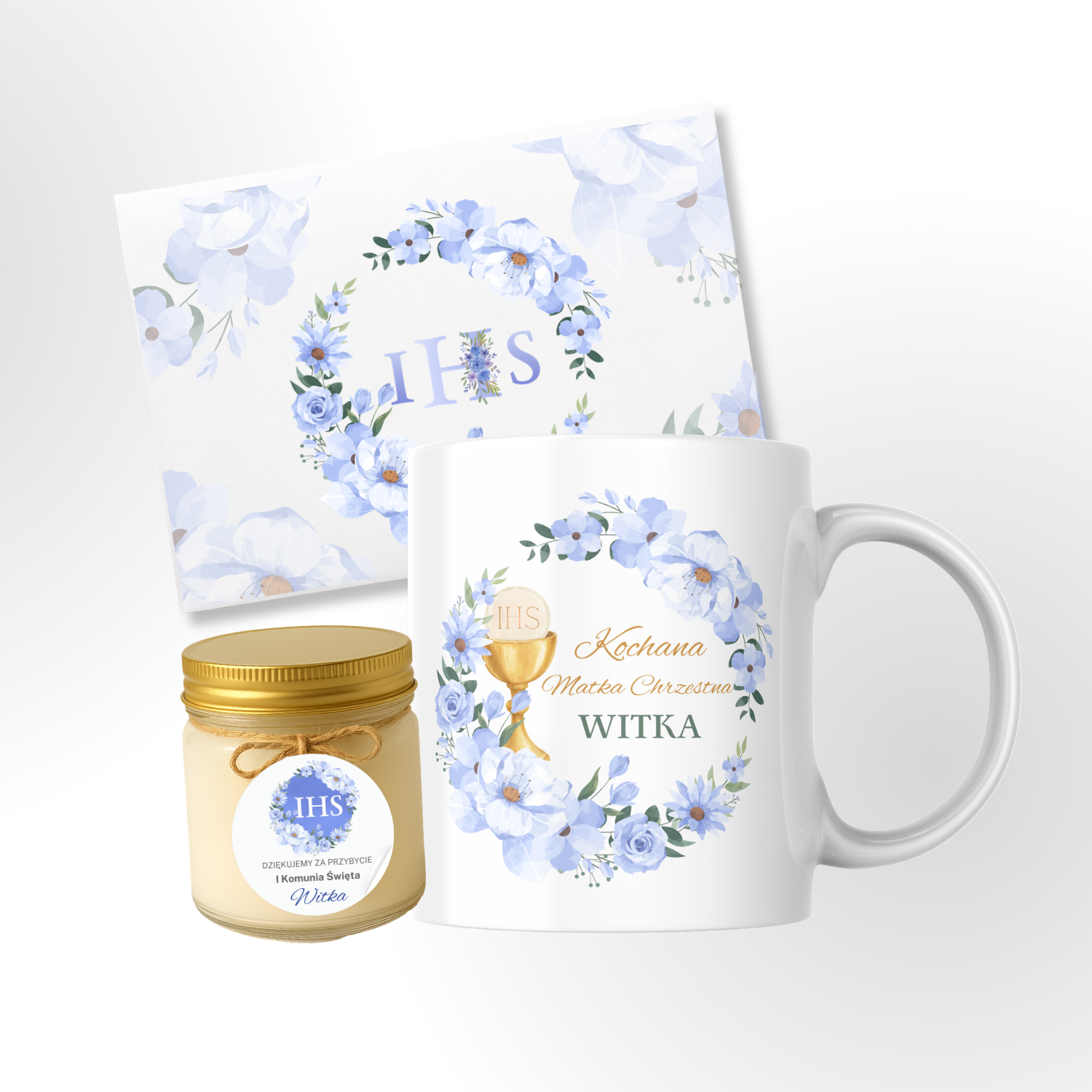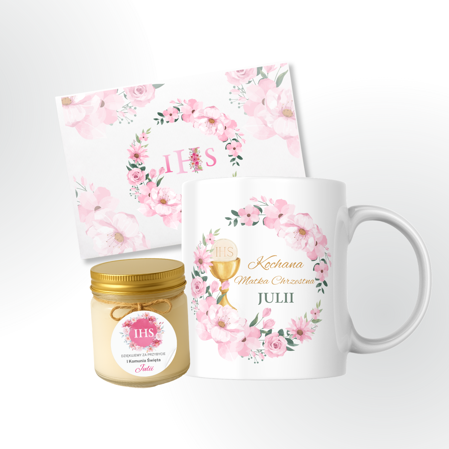 To wyjątkowy, pełen ciepła i symboliki upominek, idealny na podziękowanie z okazji Pierwszej Komunii Świętej . Każdy element został starannie dobrany i ozdobiony delikatnym, komunijnym motywem kwiatowym, tworząc spójną, elegancką całość. Całość można zapakować w ozdobne pudełko z wypełnieniem, tworząc gotowy do wręczenia prezent, który zachwyci każdego obdarowanego.