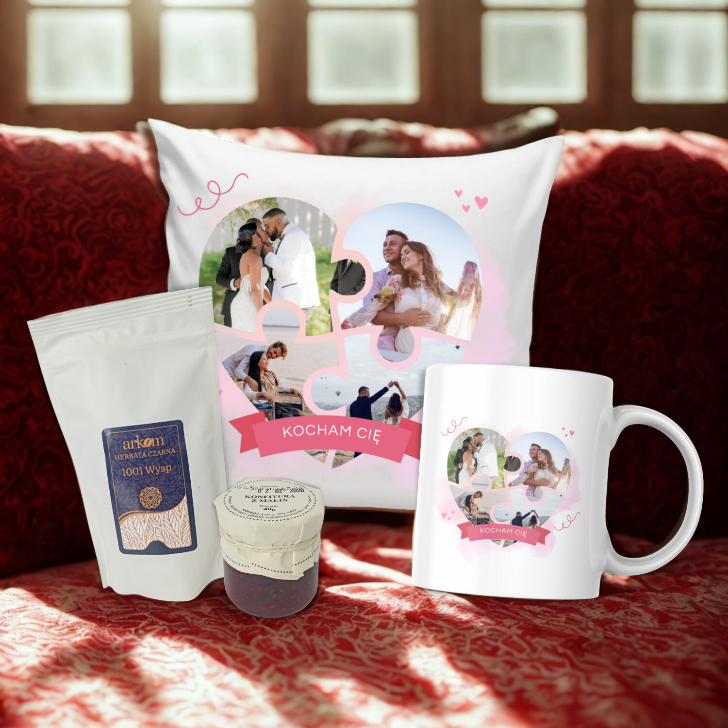 - Kubek ceramiczny z tym samym wzorem – codzienna dawka miłości przy porannej kawie lub wieczornej herbacie.